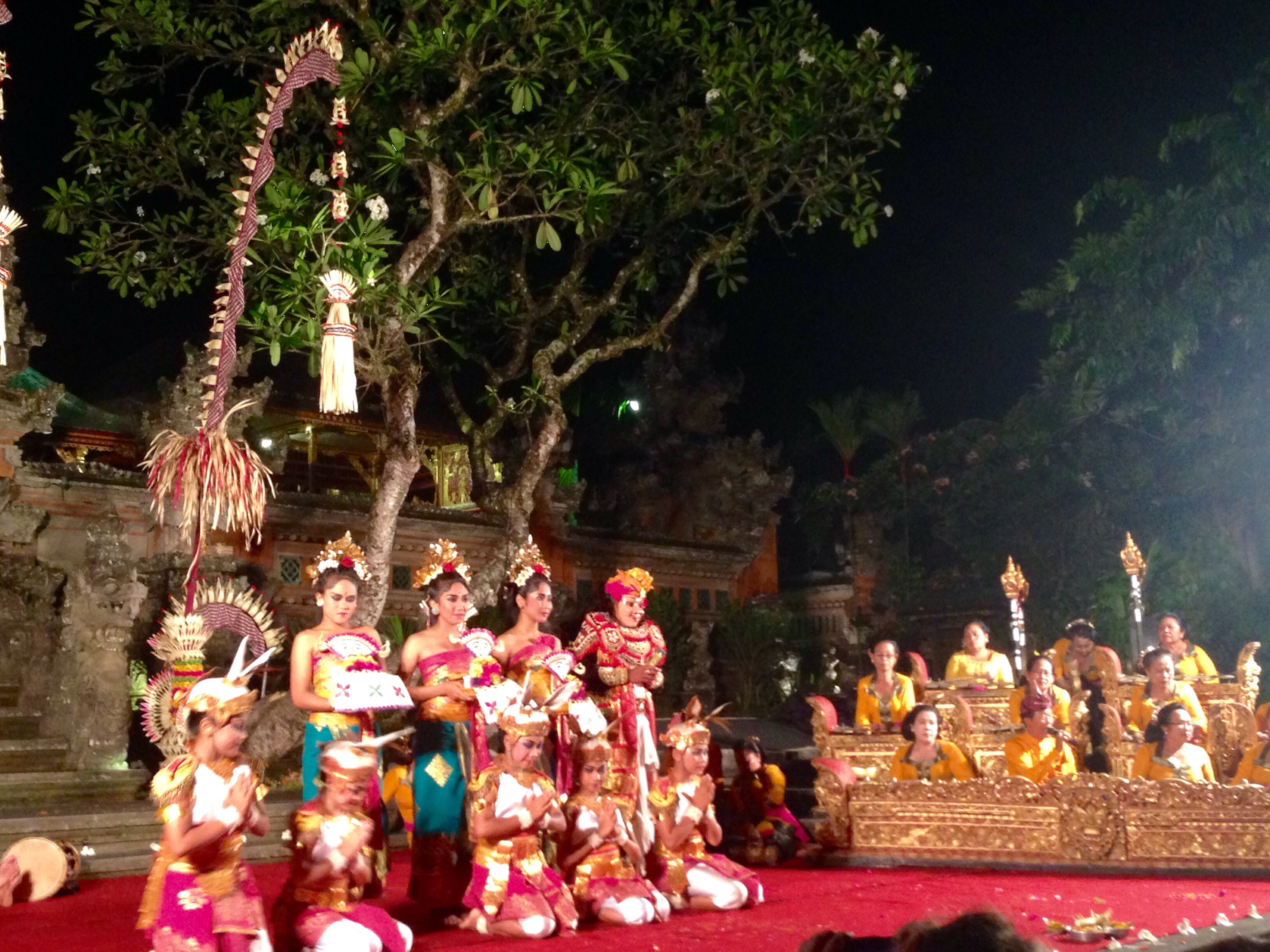 Lastly, another great activity we did which I think is a must-see in Ubud, is seeing a traditional Balinese dancing show. We got our tickets for $8 and the show went for 1 hour. There were ladies playing traditional music and other ladies dancing a strange, but traditional dance wearing impressive costumes and bold makeup. Unfortunately for us it poured with rain as we sat and watched the show without any cover, but this didn’t stop us from enjoying ourselves.
