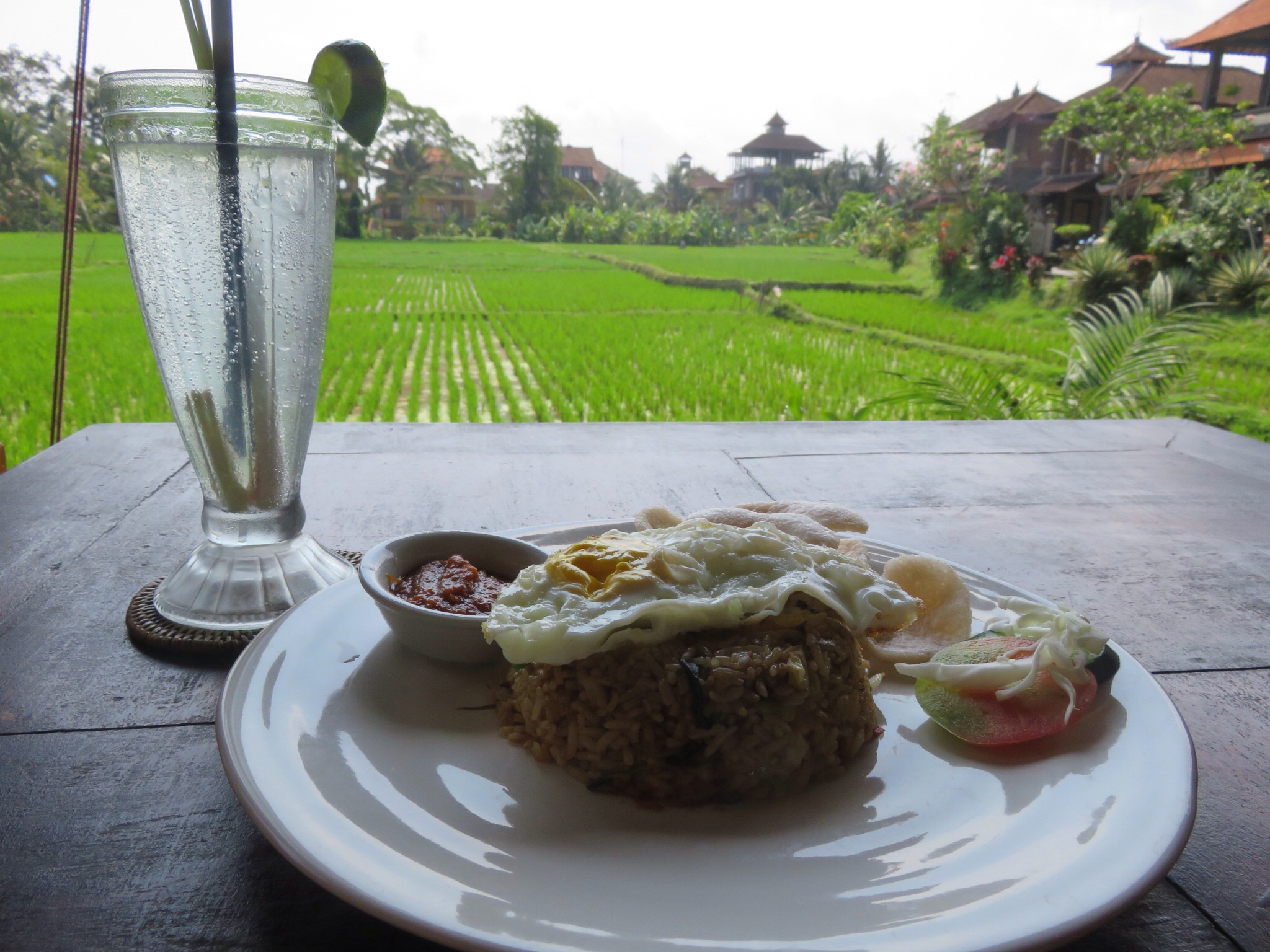 Secondly, Cafe Angsa. This place costs a little more, but for the view it’s totally worth it. It over looks a beautiful rice field which makes a perfect backdrop for a nice lunch. Again, it has tables low to ground as well as normal ones. I had a Nasi goreng (typical Balianense rice dish) and a lemongrass, ginger soda for $6. You can still eat well and plentiful for a small amount of money in Ubud.